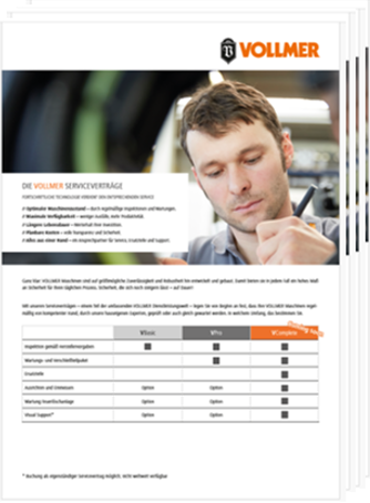 Beugen Sie vor: Der Service durch Fachleute ist die beste Voraussetzung, dass Ihnen das volle Potenzial Ihrer VOLLMER Maschine möglichst lange erhalten bleibt. Mit unseren Serviceverträgen – einem Teil der umfassenden VOLLMER Dienstleistungswelt – legen Sie von Beginn an fest, dass Ihre VOLLMER Maschinen regelmäßig von kompetenter Hand, nämlich durch unsere hauseigenen Experten, geprüft oder auch gleich gewartet werden. Wie oft und wie umfassend, das bestimmen Sie.