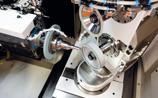 Zwei vertikal angeordnete Schleifspindeln mit der Schleifscheibe im Drehpunkt der CAchse. Reduzierte Hauptzeiten durch kürzere Fahrwege der Linearachsen.