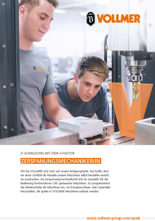 Wir bei VOLLMER sind stolz auf unsere Fertigungstiefe. Das heißt, dass wir einen Großteil der Bauteile unserer Maschinen selbst herstellen anstatt sie zuzukaufen. Als Zerspanungsmechaniker bist du Spezialist für die Bedienung hochmoderner CNC-gesteuerter Maschinen. Du programmierst die Arbeitsschritte der Maschinen ein, um komplexe Einzel- oder Serienteile herzustellen, die später in VOLLMER Maschinen verbaut werden.