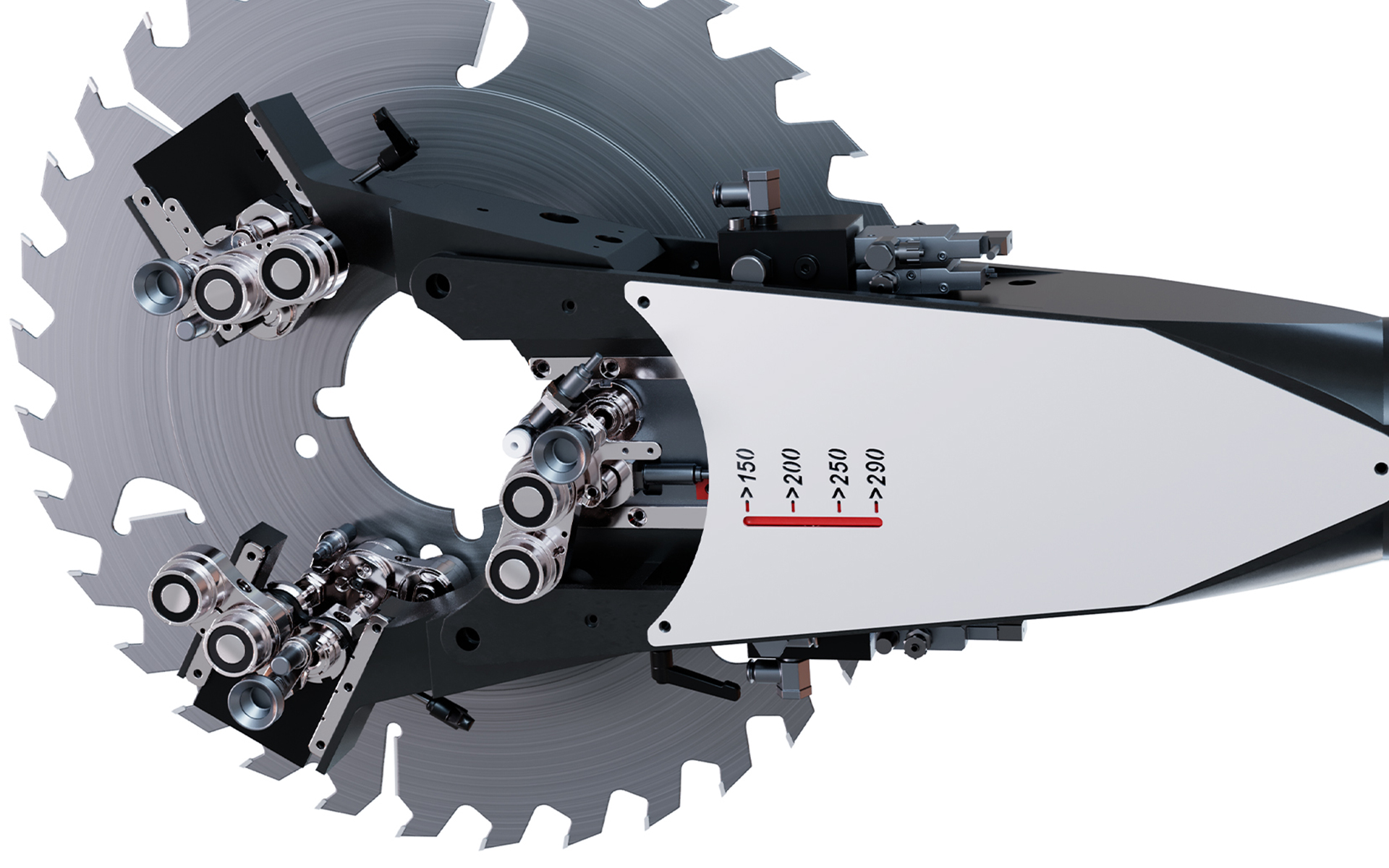 Um Kreissägen fürs Sägewerk präzise und schonend zu schärfen, hat Vollmer sein Schleifmaschinen-Duo CS 860 und CSF 860 mit einem mitdrehenden Aufnahmesystem entwickelt. Das Sägeblatt wird über Magnete mit dem Aufnahmesystem fest verbunden, um während des Schleifprozesses innenliegende Räumschneiden nicht zu beschädigen. Zudem werden dank der mitdrehenden Aufnahme die Blattbohrungen mit Keilnut oder Spline vor Verschleiß geschont. Die Zentrumsbremse mit Vorschubklinke ermöglicht eine öffnende Blattklemmung. Diese fixiert das Sägeblatt nur während dem Schleifprozess und öffnet sich, um den nächsten Sägezahn zu positionieren. Dadurch bleiben auch außenliegende Räumschneiden beim Schärfprozess unbeschädigt, weil die Blattklemmung das Kreissägeblatt nicht berührt.