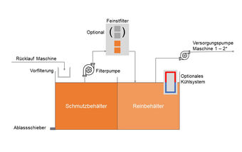 Die Filtration von Kühlöl oder Dielektrikum ist wichtig, weil beim Schleifen beziehungsweise Erodieren von Werkzeugen selbst kleinste Partikel den Schärfprozess beeinträchtigen können. Mit dem VFS 400 lassen sich Partikel mit Größen von bis zu fünf Mikrometern herausfiltern. Das verschmutzte Kühlöl oder Dielektrikum wird mit der VFS 400 aus der Schärfmaschine gepumpt und über einen Vorfilter in den Schmutzbehälter geleitet – der wiederverwendbare Vorfilter sorgt für eine besonders lange Filterstandzeit. Aus dem Schmutzbehälter führt eine Filterpumpe das Kühlöl oder Dielektrikum der Feinst-Filtration zu. Die Feststoffe werden in zwei oder optional vier Filtereinheiten mit kleinen Filterelementen aus der Flüssigkeit ausgeschieden, wobei jedes Filterelement eine Schmutzkapazität von zirka 3,5 Kilogramm besitzt.