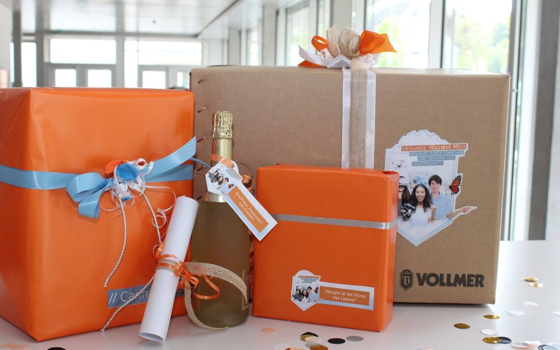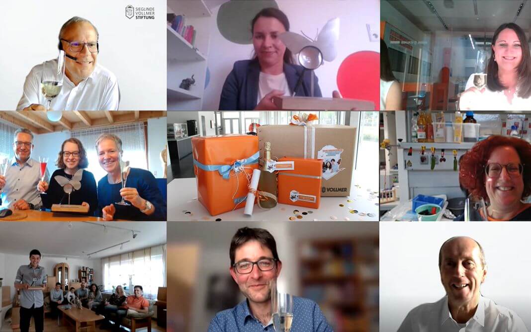 Die Verleihung der Sieglinde Preise 2021 fand im Rahmen einer virtuellen Abendveranstaltung statt. Per Videokonferenz wurden die Preisträgerinnen und Preisträger gemeinsam mit ihren Familien zugeschaltet. Vollmer Geschäftsführer Dr. Stefan Brand führte durch den Abend und auch die Vollmer Belegschaft gratulierte in einer unterhaltsamen Video-Botschaft. Für den besonderen festlichen Rahmen der Ehrung sorgten Überraschungsboxen, die den Gewinnern einige Stunden vor dem Event direkt nach Hause geliefert wurden. Diese beinhalteten nicht nur den Pokal zum Preis, ein Getränk zum virtuellen Anstoßen, sondern auch ein leckeres Drei-Gänge-Menü, das zusammen mit einer kleinen lokalen Gastronomie entwickelt und küchenfertig vorbereitet wurde.